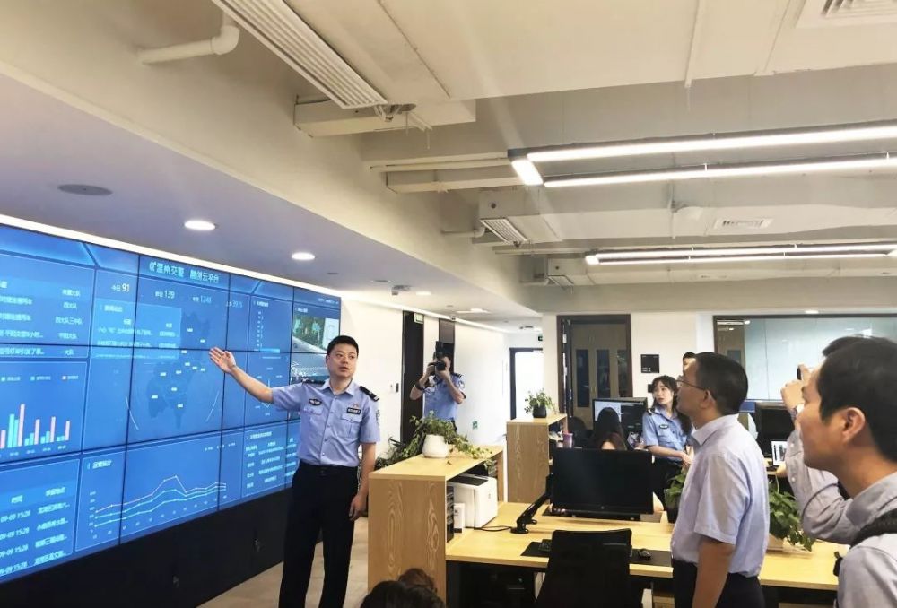 在调研第一站温州市公安局交通指挥中心,温州市交通管理局工作警员操作演示了智慧化交通管理的快速工作流程,包括温州交警勤务指挥实战平台、滴滴交通路口诊疗系统、鹰眼系统、融创云等在线警务平台。